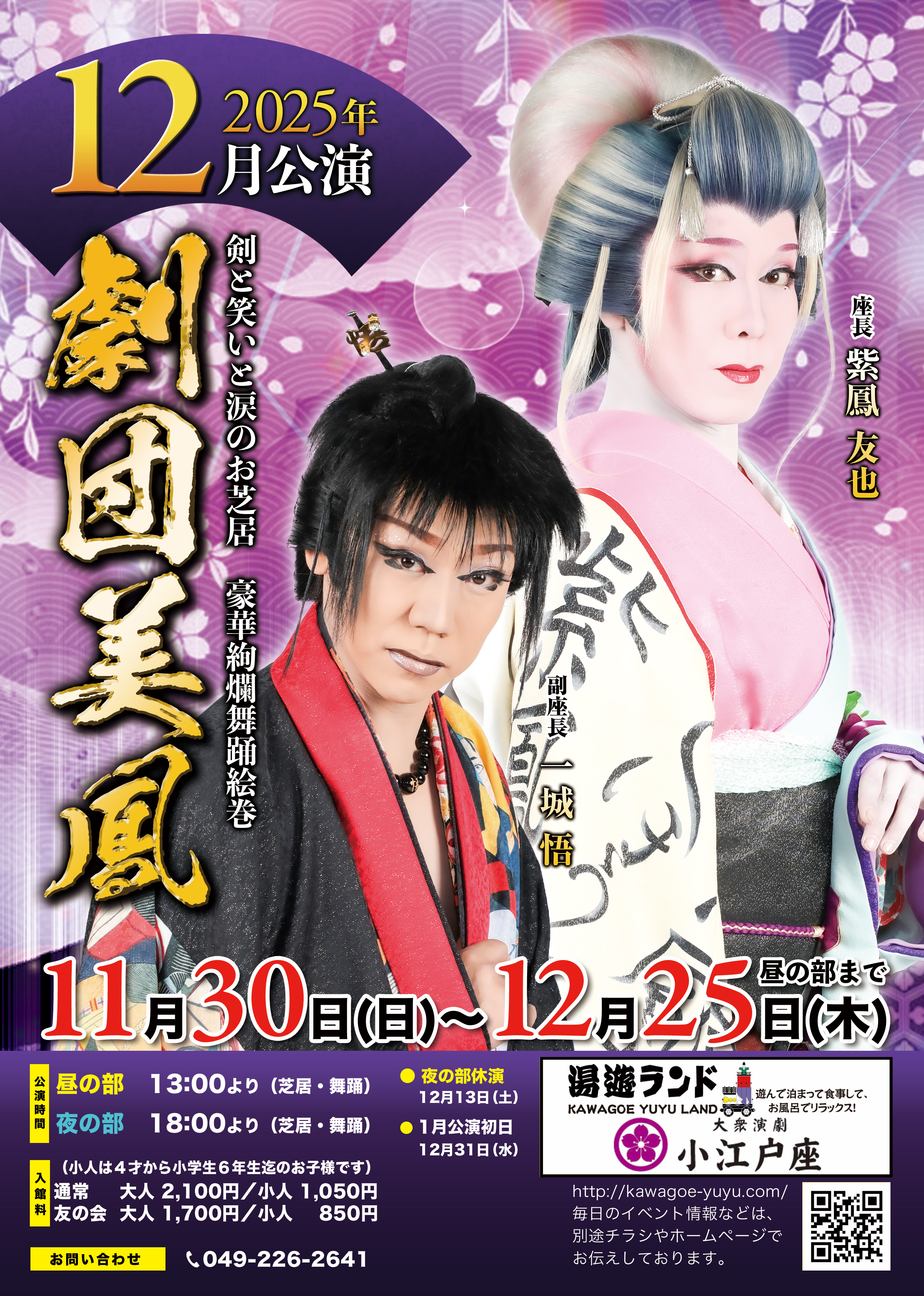 12月公演は 劇団美鳳( げきだんびほう ) 座長 紫鳳 友也 副座長 一城 悟 座席予約は11月8日(土)10:00から来館者のみ受付致します また、お電話での受け付けは 翌11月9日(日)10:00より承ります 良い [...]